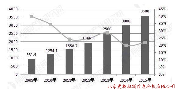 2009-2015年中國地理信息產(chǎn)業(yè)產(chǎn)值規模及增速趨勢(單位:億元,%)
