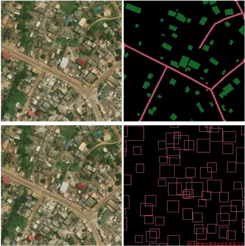 第二排的兩張圖是監督學(xué)習中的對象檢測訓練數據(左圖是衛星影像圖,右圖是房子的對象檢測框)。