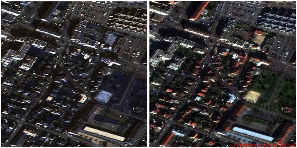 Digital GlobeWorldView-3影像兩個(gè)分辨率對比圖,左圖是分辨率為1.24米(文件大小為1.7M),右圖分辨率是0.31米(圖片大小是10.2M)