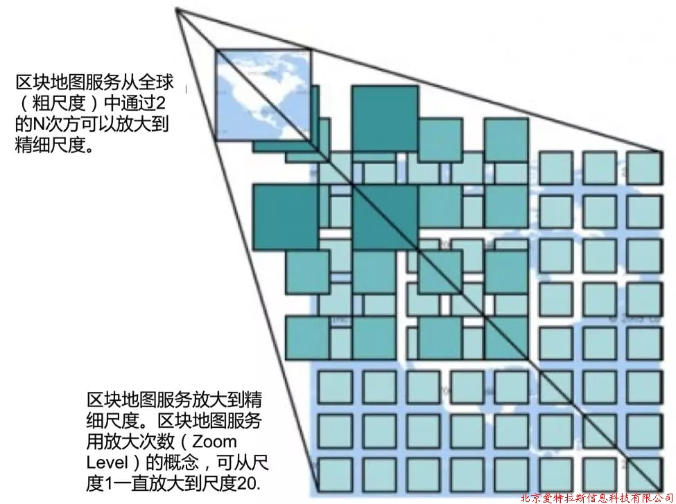 區塊地圖服務(wù)可以從全球低分辨率的衛星影像放大到高尺度的衛星影像。