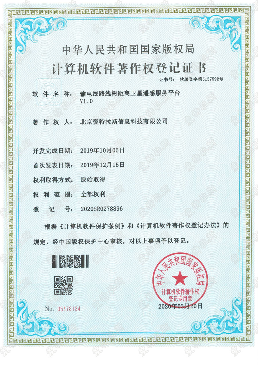 2020年3月我司又喜獲《ATLAS遙感AI平臺(V1.0)》、《輸電線(xiàn)路線(xiàn)樹(shù)距離衛星遙感服務(wù)平臺(V1.0)》、《ATLAS圖像AI平臺(V1.0)》、《“一帶一路”地信大數據服務(wù)平臺(V1.0)》、《智慧城市地理信息大數據服務(wù)平臺(V1.0)》、《應急災情報送系統(V1.0)》等六項軟件著(zhù)作權。截止目前,我司已取得包括時(shí)空數據產(chǎn)品、遙感AI產(chǎn)品、大數據共享服務(wù)平臺(WEB端、移動(dòng)端)在內的著(zhù)作權32項。