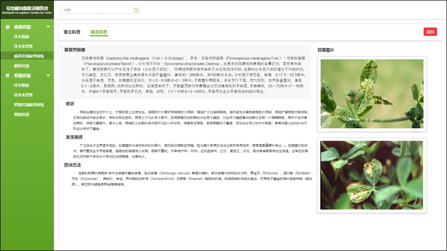 • 苜蓿病害識別:根據訓練得到的苜蓿病害識別模型,基于上傳的數碼照片在線(xiàn)識別給出相應病害類(lèi)型及防治措施。