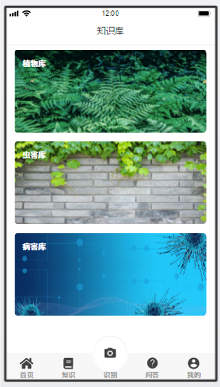 植物庫、蟲(chóng)害庫、病害庫、簽到四個(gè)快捷入口。點(diǎn)擊植物庫快捷入口,跳轉到植物庫一級界面。