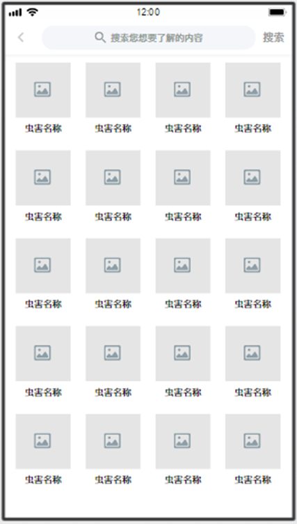 點(diǎn)擊蟲(chóng)害庫圖片,進(jìn)入農作物分類(lèi)界面,支持關(guān)鍵字搜索查詢(xún)。