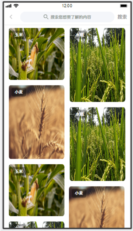 點(diǎn)擊病害庫圖片,進(jìn)入農作物分類(lèi)界面,支持關(guān)鍵字搜索查詢(xún)。