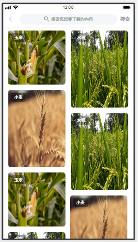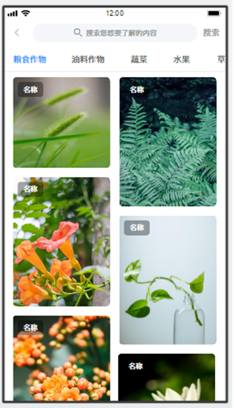 點(diǎn)擊植物庫圖片,進(jìn)入植物庫分類(lèi)界面,將植物分為糧食作物、油料作物、蔬菜、水果、草植等類(lèi)別,還支持關(guān)鍵字查詢(xún)。