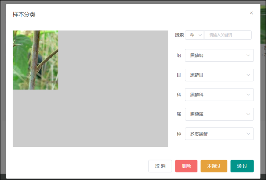彈出上傳樣本界面,填寫(xiě)樣本名稱(chēng)及其綱、目、科、屬、種,上傳圖片,點(diǎn)擊“立即添加”按鈕,添加樣本。