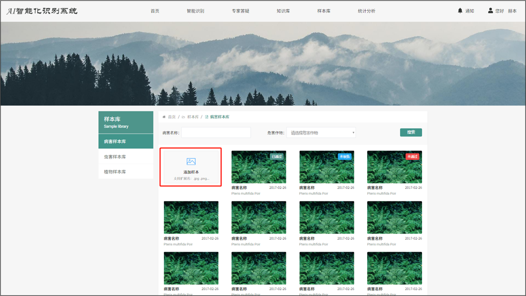 在病害、蟲(chóng)害、植物樣本庫中點(diǎn)擊添加樣本。