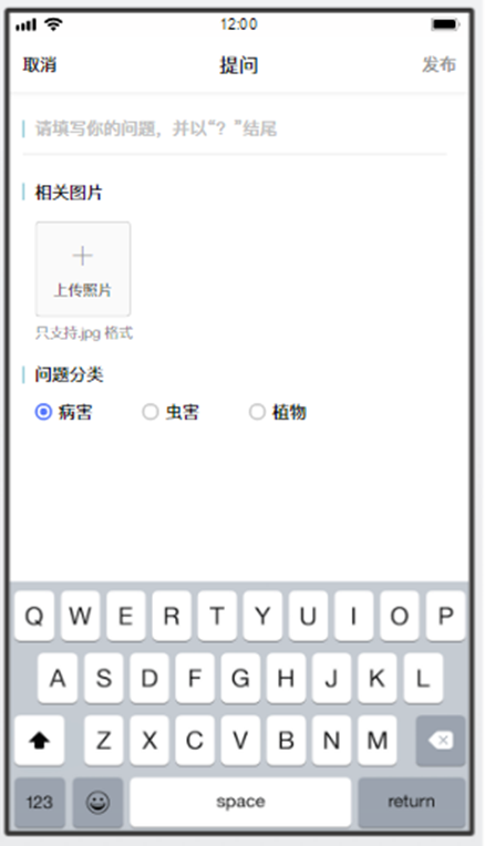 點(diǎn)擊提問(wèn)按鈕,進(jìn)入提問(wèn)界面,上傳圖片、填寫(xiě)問(wèn)題描述、選擇問(wèn)題類(lèi)型,點(diǎn)擊發(fā)布。