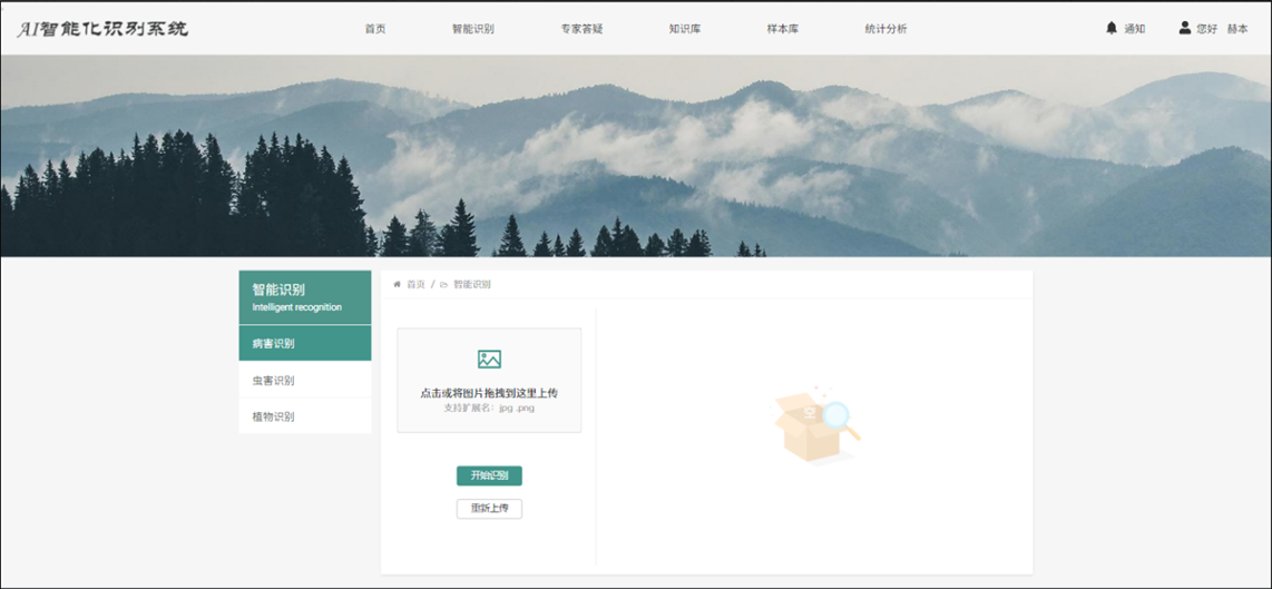 點(diǎn)擊左側功能欄“病害識別”或者“蟲(chóng)害識別”或者“植物識別”,顯示如下圖所示。上傳圖片,點(diǎn)擊“開(kāi)始識別”按鈕識別圖片。結果顯示在頁(yè)面右側。