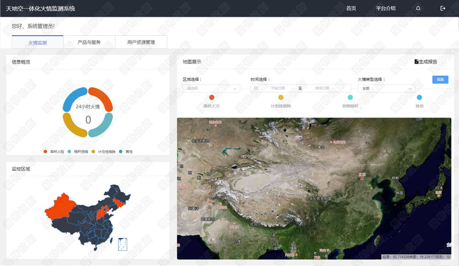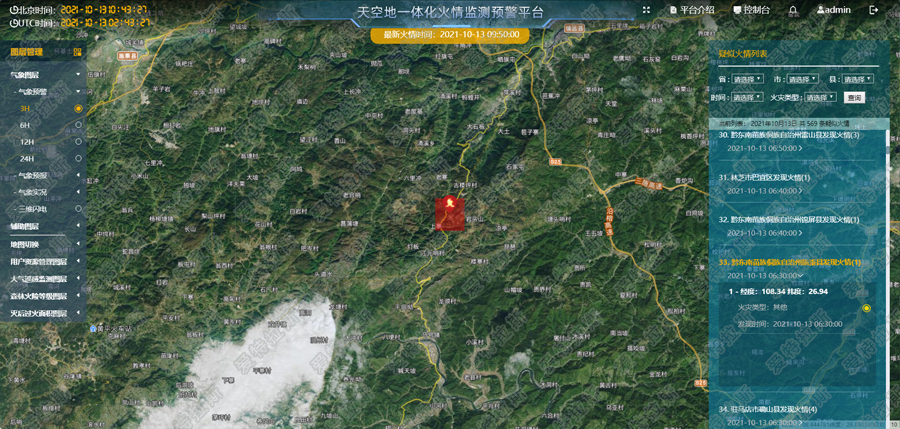 本平臺根據 《“十四五”林業(yè)草原保護發(fā)展規劃綱要》中的“林業(yè)生態(tài)監測”需求,結合使用靜止衛星打造出“天空地一體化火情監測預警平臺”,下圖為平臺主要界面。