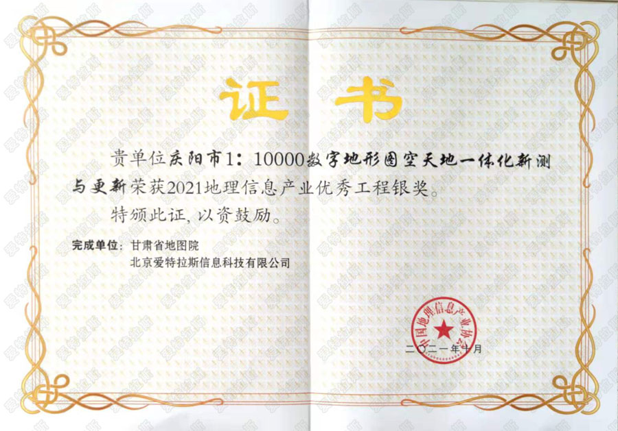 二零二一年十月,經(jīng)過(guò)中國地理信息產(chǎn)業(yè)協(xié)會(huì )嚴格評選,我公司參與項目《慶陽(yáng)市1:10000數字地形圖空天地一體化新測與更新》項目榮獲2021地理信息產(chǎn)業(yè)優(yōu)秀工程銀獎,我司總經(jīng)理為該項目獲獎?wù)咧弧?/span>