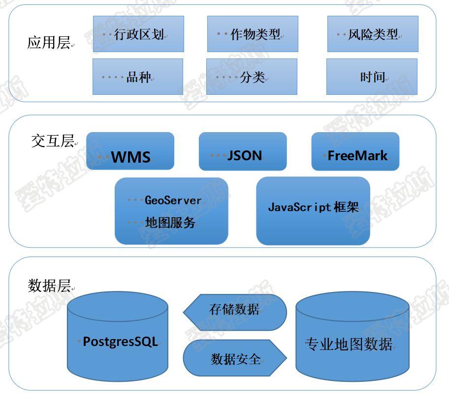 針對業(yè)務(wù)應用需求的實(shí)現,選擇行政區劃、作物類(lèi)型和風(fēng)險類(lèi)型等,為頁(yè)面提供數據庫管理與地圖配置、專(zhuān)題信息查詢(xún)展示以及其他交互式應用等功能;