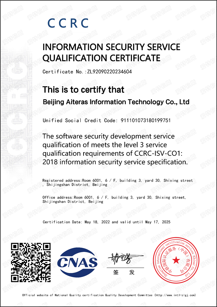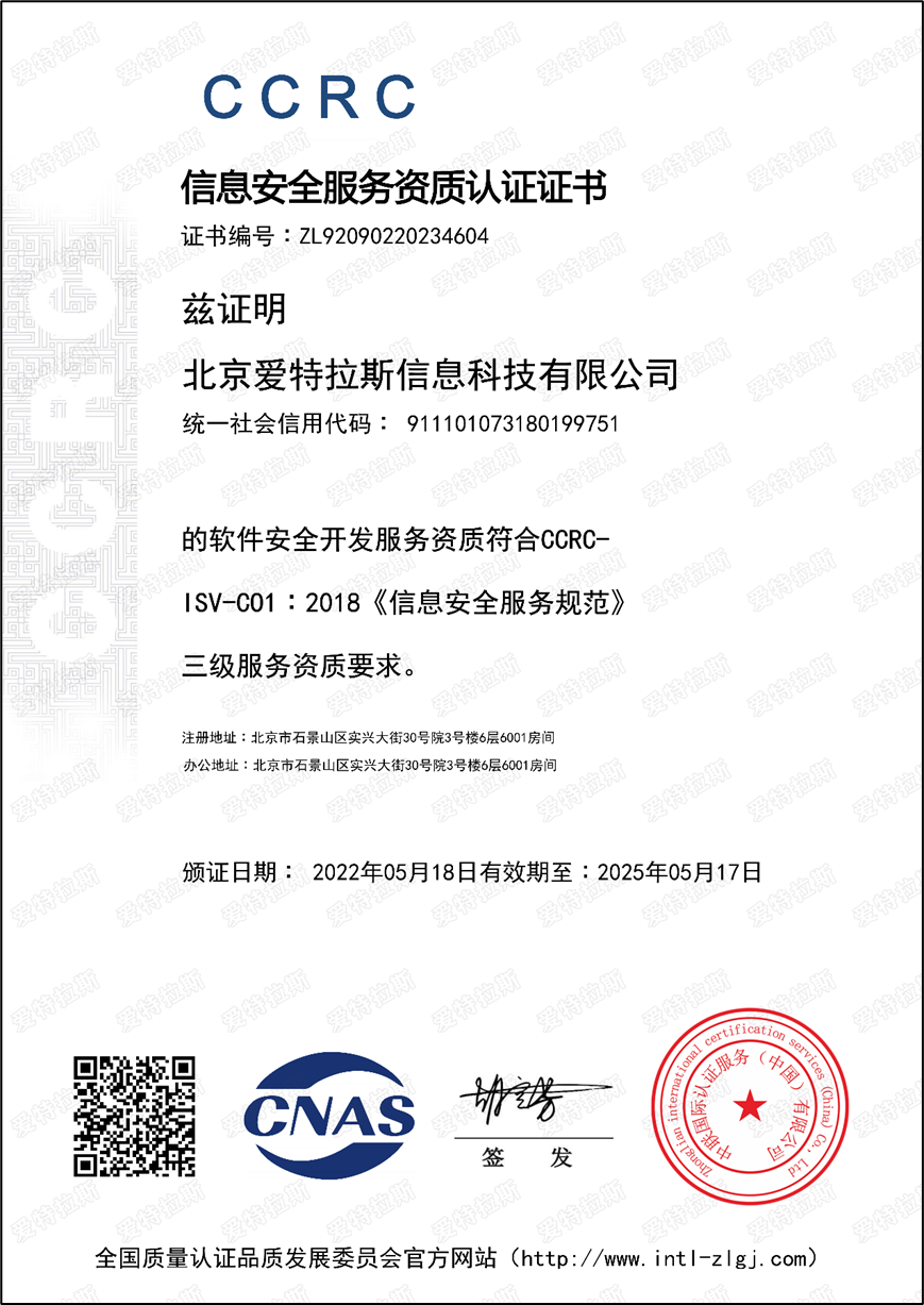 經(jīng)評審認定,北京愛(ài)特拉斯信息科技有限公司(以下簡(jiǎn)稱(chēng)愛(ài)特拉斯)通過(guò)信息安全風(fēng)險評估三級服務(wù)認證,取得CCRC信息安全服務(wù)資質(zhì)證書(shū),數字化安全建設又向前邁進(jìn)一步。這是對愛(ài)特拉斯安全服務(wù)能力的充分證明和高度認可。