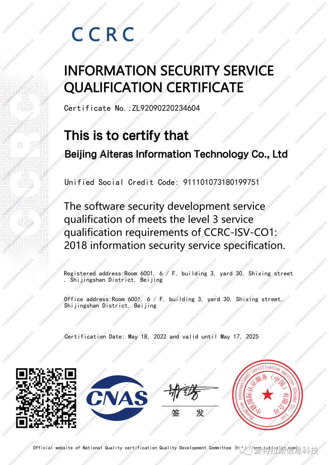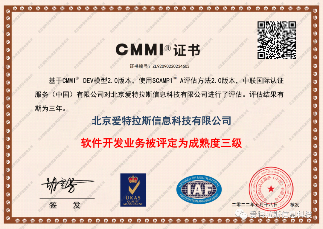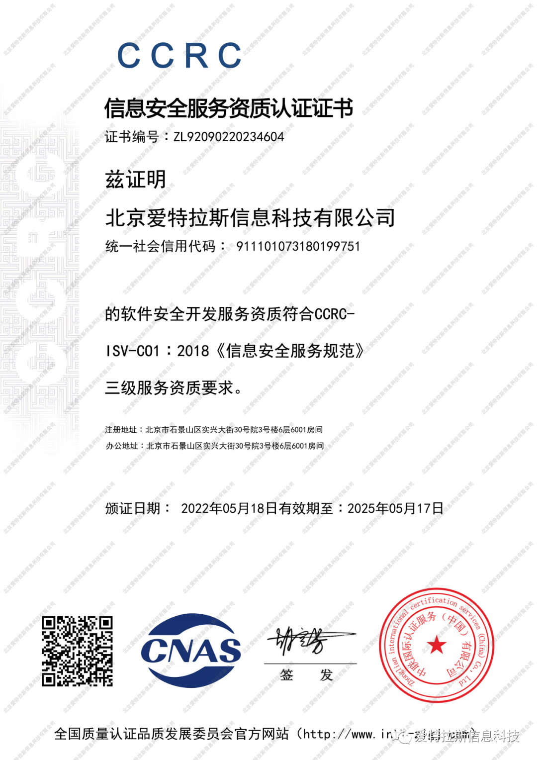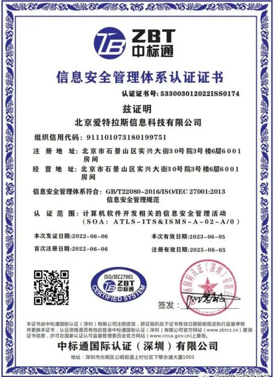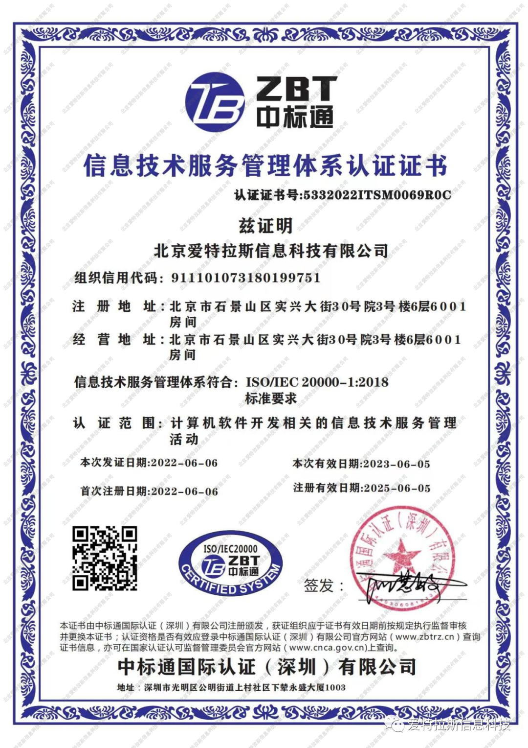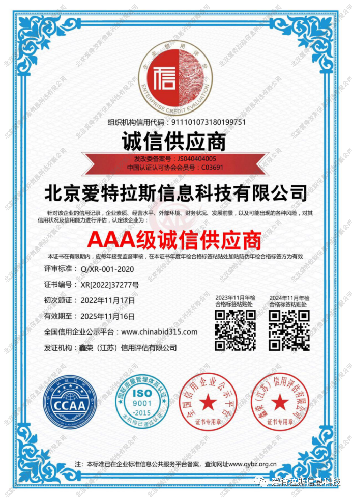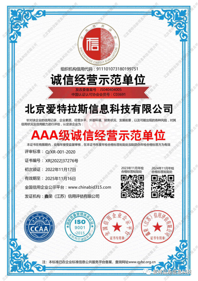 2022年,北京愛(ài)特拉斯信息科技有限公司榮獲ISO質(zhì)量管理體系+ISO信息技術(shù)服務(wù)管理體系+ISO信息安全管理體系認證+CCRC信息安全服務(wù)資質(zhì)認證+知識產(chǎn)權管理體系認證證書(shū)+CMMI3級+AAA級企業(yè)信用認證。
