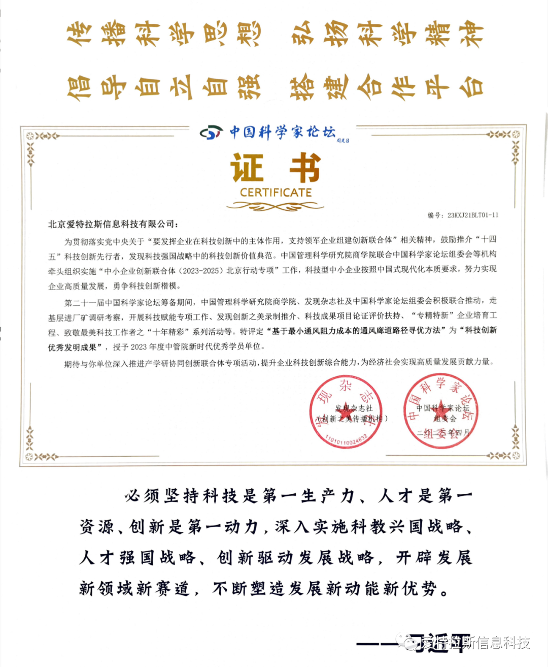 第二十一屆中國科學(xué)家論壇在舉行期間,經(jīng)過(guò)嚴格的資質(zhì)審核,特評定公司為“空間大數據科技創(chuàng )新領(lǐng)軍型企業(yè)”,并授予公司為2023年度中管院新時(shí)代優(yōu)秀學(xué)員單位;特評定公司自主研發(fā)的“基于最小通風(fēng)阻力成本的通風(fēng)廊道路徑尋優(yōu)方法”為“科技創(chuàng )新優(yōu)秀發(fā)明成果”,并授予2023年度中管院新時(shí)代優(yōu)秀學(xué)員單位;特授予公司總裁“中國式現代化(空間大數據)科技創(chuàng )新引領(lǐng)者”榮譽(yù)稱(chēng)號,并授予其為2023年度中管院新時(shí)代優(yōu)秀學(xué)員。