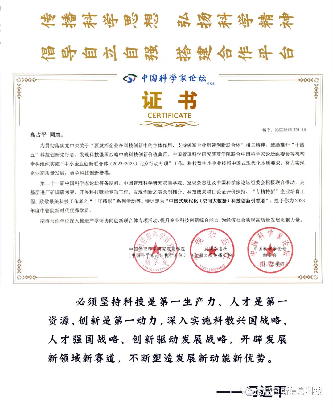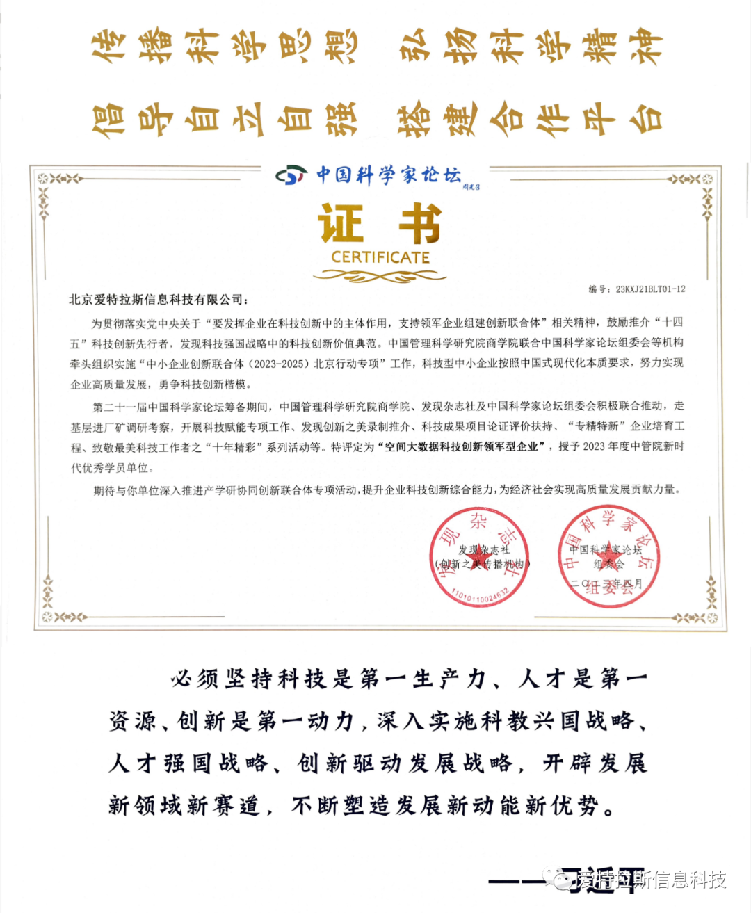2023年4月27-28日,第二十一屆中國科學(xué)家論壇在北京會(huì )議中心隆重舉行,來(lái)自全國各地的近2000位科技工作者、專(zhuān)家學(xué)者、企業(yè)家等出席了會(huì )議。本屆論壇以“中國式現代化與科學(xué)技術(shù)體系化創(chuàng )新”為主題,旨在推動(dòng)中國科技創(chuàng )新和高質(zhì)量發(fā)展,促進(jìn)科技交流與合作;本屆論壇設立了多個(gè)分論壇和專(zhuān)題討論,涵蓋了信息技術(shù)、生態(tài)文明、新能源、人工智能、生物技術(shù)、新材料、健康醫學(xué)等多個(gè)領(lǐng)域,參會(huì )專(zhuān)家學(xué)者在會(huì )上深入探討相關(guān)領(lǐng)域的最新研究進(jìn)展和未來(lái)發(fā)展趨勢,共同推動(dòng)中國科技事業(yè)的快速發(fā)展;會(huì )議期間啟動(dòng)了第二十二屆中國科學(xué)家論壇科創(chuàng )大調研活動(dòng);同時(shí)召開(kāi)了第六屆中國企業(yè)首席科學(xué)家論壇。北京愛(ài)特拉斯信息科技有限公司總裁高占平同志受邀參加。