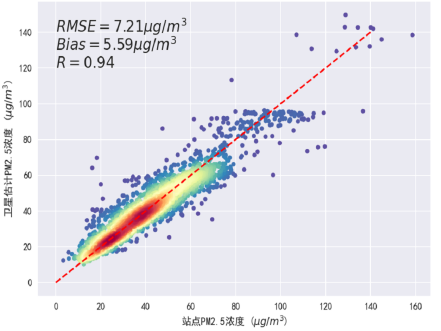 研究以地面實(shí)測數據為基礎,繪制了與遙感估算數據的散點(diǎn)密度圖,其RMSE為7.21μg/m3,偏離Bias為5.59μg/m3,相關(guān)性R達到了0.94,參數日級估算精度達到94%,誤差為6%。