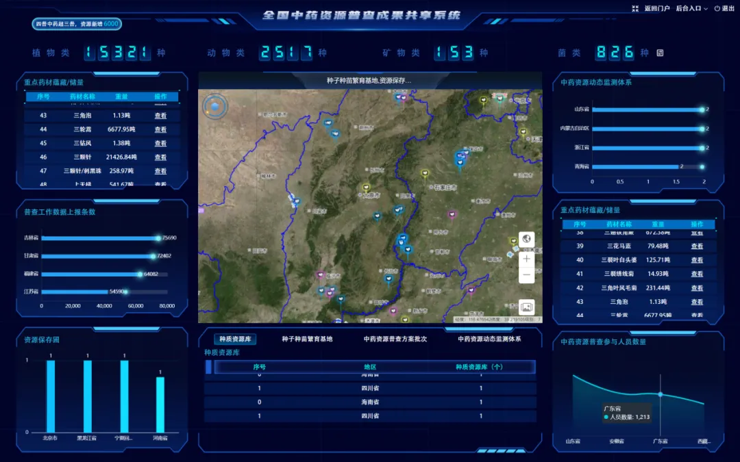 普查成果共享系統上線(xiàn)后,其強大的數據查詢(xún)、瀏覽、匯總分析及可視化展示功能令人眼前一亮。通過(guò)地圖、餅圖、柱狀圖、表格等多種直觀(guān)形式,系統從多維度、全方位地呈現了中藥資源普查的豐富成果,使數據生動(dòng)鮮活,易于理解與利用。
